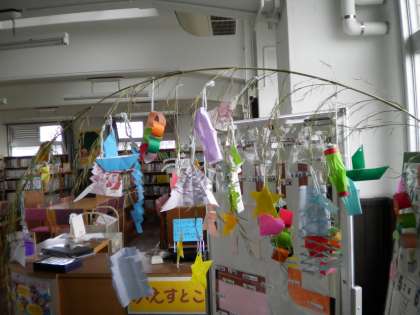 7月7日 廊下や図書室に七夕の飾りがあります。廊下には,子ども達がつくった飾りや願い事の短冊が笹にぶら下げてあります。図書館には,図書ボランティアの方がつくってくださった飾りがあります。天候はよくないですが,みんなの願いがかないますように・・・・・。