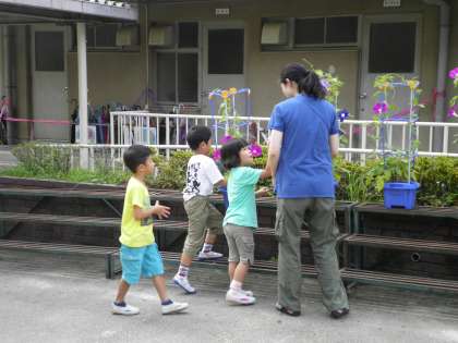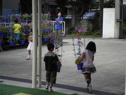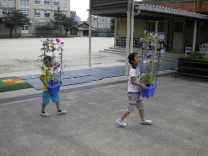 7月11日 心配されたアサガオ。台風のため,校舎内に一時避難していたアサガオが元の場所に戻りました。毎日,伸びてきたツルを大事にもつれないように巻きつけて例年以上にきれいな1年生のアサガオです。近所の人も見に来られるぐらいにきれいに咲いています。もうすぐ,一人一人のお家に移動します。