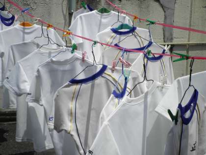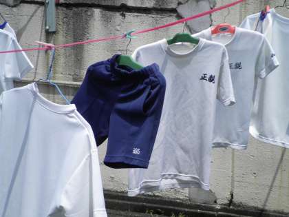 7月11日 まぶしい日差しを浴びて,6年生の洗たくした体操服が気持ちよさそうに揺れています。いかにも汗を洗い流し,気持ちよさそうです。「気持ちいい!」という声が聞こえそうです。