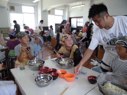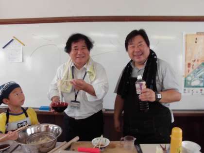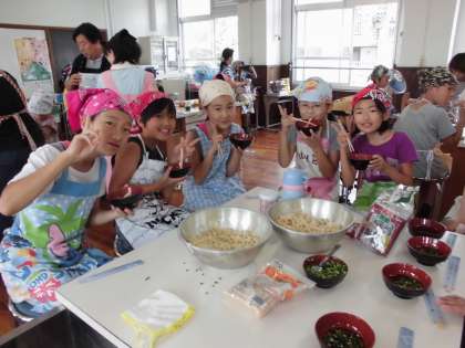 できあがったうどんは,きしめん風… さぬきうどん風… 様々ですが,一生懸命つくったうどんはどれも ほっぺたが落ちそうなほどおいしかったです。こどもも笑顔 校長先生も笑顔 お師匠さんも笑顔… みなさん ありがとうございました。