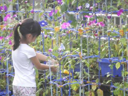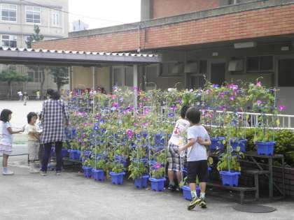 7月15日 1年生が今日もアサガオの手入れと水やりをしています。枯れた花を摘み取ったり,水やりをしたりして例年以上の綺麗なアサガオが咲いています。近所の高齢者の方が「きれいなアサガオですね。」と通りすがりによく観に来られます。夏休みには,子ども達が持ち帰り,世話を続けます。秋にはいっぱい種ができそうです。頑張って,1年生!