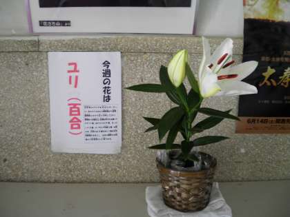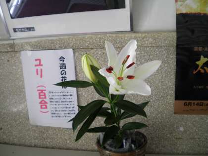 7月15日 今週の花「ゆり(百合)」が今日開きました。昨日まで固く閉ざしていたつぼみがきれいな花に変身しました。素敵な香りとともに。