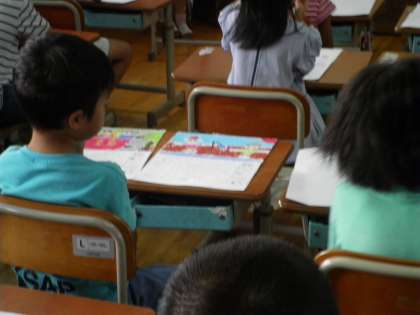 8月26日 久しぶりに活気を取り戻した学級では夏休の思い出の発表や自由研究の作品紹介などが行われていました。各教室の掲示板には夏休みに描いた絵や自由研究が張り出されていました。