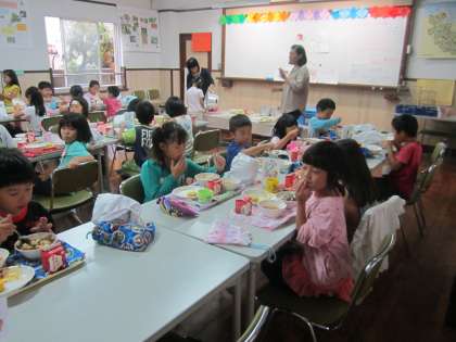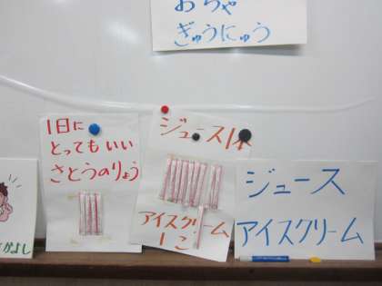ランチルームで食の栄養教諭から食の指導を受けました。砂糖の取り過ぎると,体に良くないことを学びました。 その後は,静かにおいし給食をよく噛んで食べました。もう1年生というより半年過ぎたので1.5年生ですね。