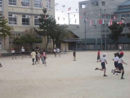 10月10日 今朝も6年生が大文字支部予選会に向けて頑張って走っています。無理せず,マイペースで頑張っています。みんなで練習にチャレンジしています。そばで遊んでいる子ども達も応援しています。
