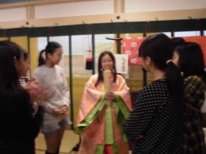10月20日 今日は6年生が京都市生涯学習総合センター(アスニー)に行きました。6年生は,総合的な学習の時間に正親小学校にかかわる歴史を調べています。そのため,アスニーで平安京についてお話を聞きに行きました。まず,正親小学校の建っているところが平安宮にあり,大蔵省の跡地であったなど興味深いことを聴きました。説明を聞いた後,体験コーナーでは平安時代の遊び(貝の絵合わせ・囲碁など),衣装をつけるなどしました。