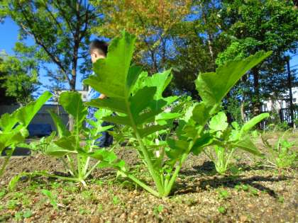 他の作物よりも少し遅れてニンジンの芽が顔を出し始めました。ニンジンは収穫まで約100日。もう少しかかりそうですが,新たなたくさんの芽が,遠い収穫の日まで楽しい毎日にしてくれます。大根の葉は青々と育ちとても美しい色です。