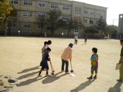 10月25日 今日は土曜学習で,地域のグランドゴルフクラブの方と子ども達が交流をしました。地域のグランドゴルフの愛好者8名と子ども達30数名がグループに分かれ,8ホールをまわりました。子ども達は,地域の方にスティックの持ち方や打ち方を習いながら頑張っていました。子ども達の中にはホールイン・ワンをした子どももいました。楽しい半日でした。