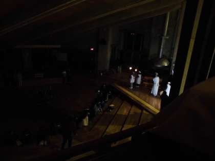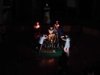11月7日 3日目の夜の活動は,待ちに待ったキャンプファイヤファイヤーです。しかし,天候が悪くキャンドルファイヤーに変更ました。午後7時10分,山から火を持った子神を連れて,山の神が登場。「正親の子よ,この火の神からいただいた火で大いに楽しむがよい!」という言葉でスタートしました。真ん中のたくさんのろうそくの火を囲んで思い出をいっぱい作りました。