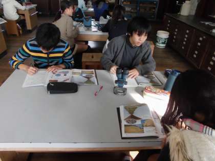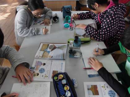 今日は顕微鏡で火山灰の観察をしました。
