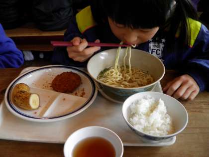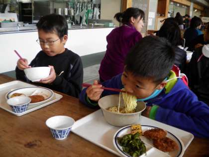 11月7日 いよいよ山の家最後の食事です。今日の昼食は,焼き肉どんぶりかラーメンか究極の選択です。子どもたちは迷ったあげく,「よし,焼き肉どん」「私は,ラーメン」と食堂に入っていきました。いただきま〜す!