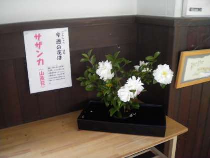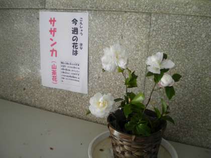11月11日 今週の花は先週と同じサザンカ(山茶花)です。でも色は白です。綺麗な白い花が廊下に輝いています。「きれい!」「いい匂い!」と子ども達も喜んでいます。いつの間にか花に関心のある子どもが増えてきました。