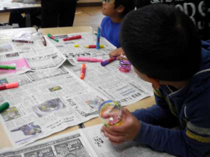 11月15日 クリスマスのオブジェづくりは,2つの部屋で学生さんに教えていただきながら作成しました。ペットボトルを半分に切り,できたコップにマジックで模様を描きます。その間に中庭では,いもが焼けています。