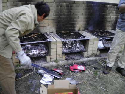 オブジェづくりの間にカマでは焼きいもが・・・・・・