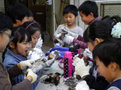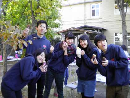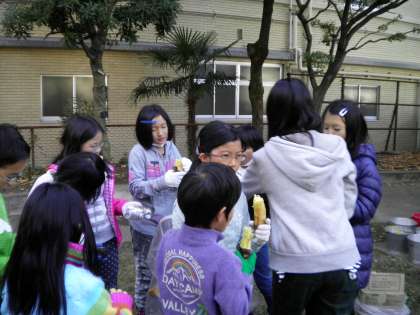 11月15日 オブジェづくりを始めて30分後,おいしいそうな焼き芋ができました。PTAのお母さんから受け取ったほかほかの焼いもをみんなで食べました。お世話になった同志社の学生さんや参加のお父さんやお母さんも「おいしい!」と言いながら食べられていました。