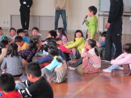 11月28日 今日の正親のつどいは,5年生の長期宿泊学習「山の家」(11月4日〜7日の4日間)の発表です。楽しかったことや学んだことをグループにわかれて発表してくれました。二条城北小学校との交流ゲームや夕食のカレーづくり,花脊焼き(陶器)などスクリーンを通して発表してくれました。感想を聞く場面では,各学年の子ども達が「早く行きたい」「楽しそう」「僕も体験したい」など感想を言ってくれました。