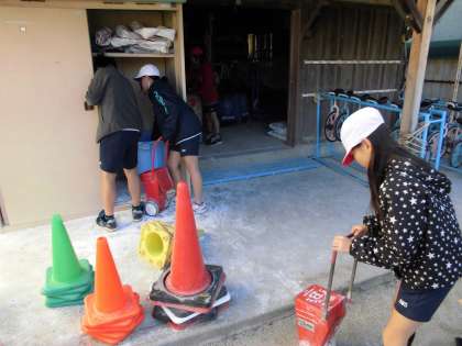 本部委員会の6年生が中間休みのランニングの準備をしています。