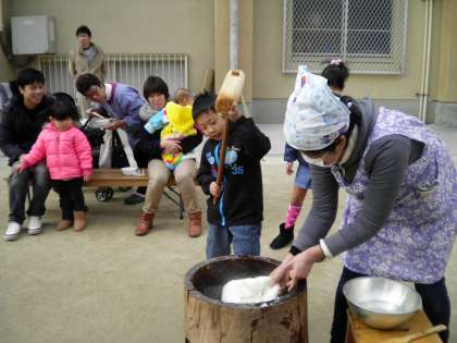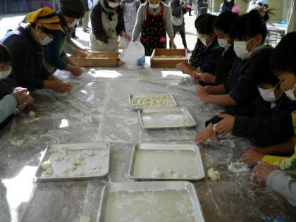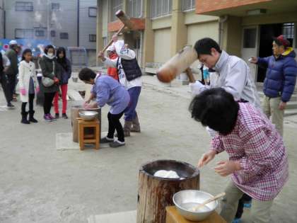12月6日 今日は本校の運動場で,正親少年補導委員会主催の餅つき大会がありました。120名の子ども達や保護者・地域の方が参加して盛大に行われました。大人に交じって子どもも餅をついていました。