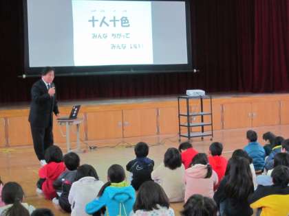 校長先生から,後期をふり返るお話がありました。いろいろな行事を通して「豊かな心」が育ってきたこと,これからも相手を思いやる気持ち,仲間と助け合う気持ちを大切に,ますます「豊かな心」を育てることが大切であることについてお話されました。