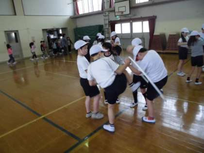雨が降り続いていますので,体育館での体育になりました。協力しないとうまくいかない運動です。真剣に話を聞いて,力を合わせて工夫して運動していると,1年生が探検にやってきました。