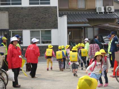 今日は,1年生の交通安全教室。昨日までは,下校コースに分かれて先生と一緒に帰っていましたが,今日からは自分たちで下校です。