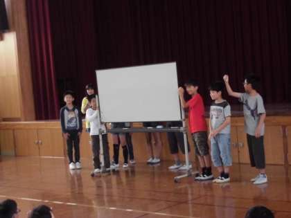 今朝の児童朝会は,まず放送委員会の活動報告とクイズ・放送生ジャンケンでした。昼の放送は好評で,全校児童が楽しみにしています。広報・本部委員会は「海外支援でペットボトルキャップを集めようキャンペーン」告知を寸劇でしてくれました。ペットボトルキャップマンが登場し笑いの中にもしっかり印象に残るキャンペーンでした。役がそろっています。