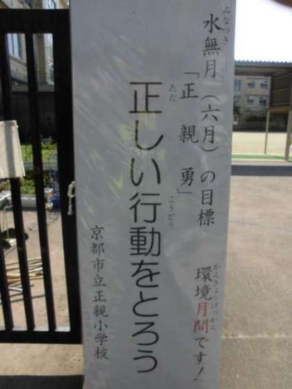 6月は環境月間です。112年前の6月に本校の校訓「正 親 勇」が制定されました。それにちなんで,今月の目標は「正しい行動をとろう」です。 学校の環境を整えるため力をあわせていきましょ。