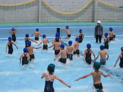 これからの水泳学習を安全に進めることができるように,きまりを確認しながら水遊びを楽しみました。