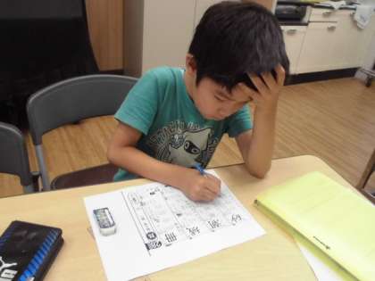 放課後なまび教室の子どもたちは、宿題をせずに自分に合った問題にチャレンジしています。自主的に学習をすすめ、経験豊富な先生に見ていただいていますから、学力もぐんぐん伸びることと思います。暑い中でも冷房のきいた部屋で集中して取り組んでいます。