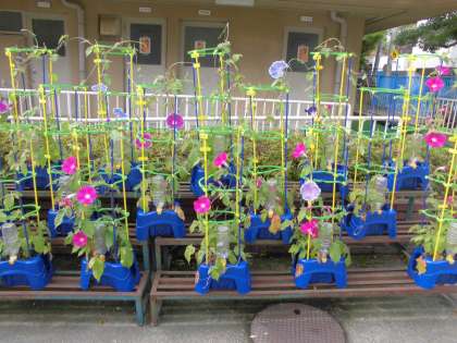 アサガオがたくさん花を咲かせています。水やりや雑草抜き,毎日の世話を大切にしてくれてます。
