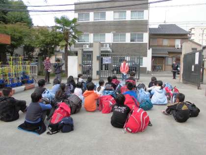 今日から,花背山の家自然体験宿泊学習が始まりました。出発式をして,みんなで「めあて」を確認しました。今日のめあては「協力」です。5年生23人,みんなで協力して,素敵な思い出をたくさん作ってきてくださいね。