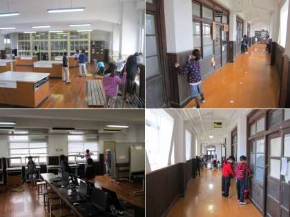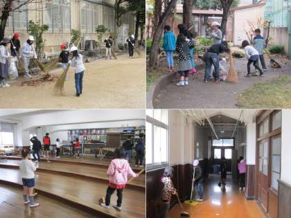 地域の方と校区の清掃活動をしている間,各グループの半分の子どもたちは,学校の中を協力して掃除しました。日頃,そうじ割り当ての無い特別教室や東校舎や落ち葉でいっぱいの運動場やふれあい広場をリーダーを中心に役割を決め,がんばりました。