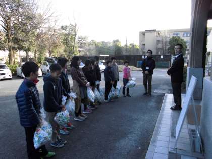 全校で集めたペットボトルのキャップがかなり集まったので,二条中学校へ本部委員が持っていきました。少しの善意が大きな力となることでしょう。二条中学校の教頭先生が受けとってくださいました。みなさんの善意がどのように使われるのか楽しみですね。
