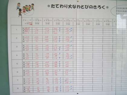 たてわりグループでの大なわとびの練習が始まって1週間。これまでの5分間での最高記録は6−桃,7−黄グループの427回です。今年は,毎日のグループのガンバリを次の日につなげるために,毎日の記録をみんなが見えるようにしています。本番までコツコツと練習を続けてくれたらいいなと思います。