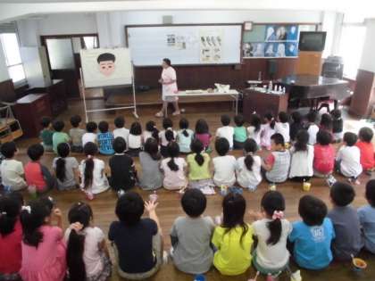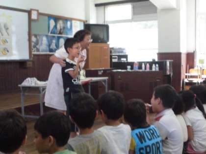 1.2年生が歯科衛生士さんから,歯磨きの指導を受けました。「よく噛んで食べると,だ液が出て虫歯になりにくい」等のお話を聞いてから,実際に磨き方を習いました。