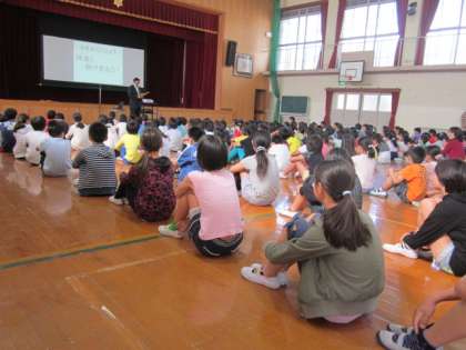 朝会では6月の目標「仲良く,助け合おう」についての話をしました。子ども達は真剣に話を聞いてくれました。たまにはトラブルもあるでしょうが,そんな時,どのように解決していけばよいか考えてくれると思います。英語の絵本もみんなで読んでみました。早くから英語にも親しめるといいですね。