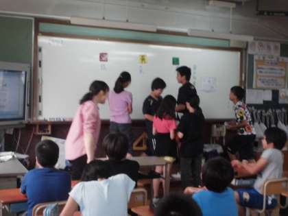 ランチルームでの給食の後,新しい栄養教諭から「食の指導」を受けました。食材を3つの赤・黄・緑のグループに分け,それぞれの働きを確認しました。いつもバランスの良い食事ができるといいですね。