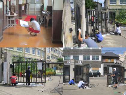 今日は,職員作業日。廊下のセンターマークの書き直しと門扉のペンキ塗りをしました。暑い中でしたが,教職員が力を合わせて一気に作業を終えました。