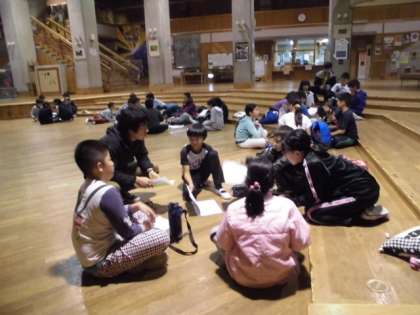 振返りは広いオリエンテーションホールで行いました。助け合う姿,励ましあう姿があちこちにみられた2日目でした。そろそろ就寝準備です。