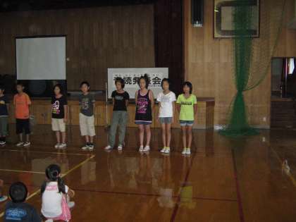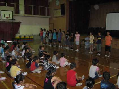 体育館の全校のみんなが集まり,みんなの前で発表しました。
