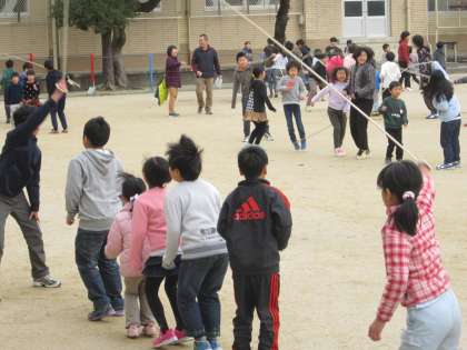 中間休みにたてわりグループで活動します。10分間で何回跳べるか。初日の記録から何回記録を伸ばせるか。2月17日には,練習の成果を確かめるたてわり大なわとび大会も予定されています。みんないい顔で跳んでいました。