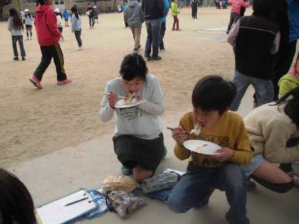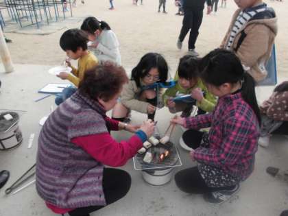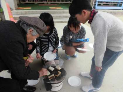 地域の皆さんにご来校いただき,七輪でのもち焼きを体験しました。炭をいこすのに苦労したグループあり,順調すぎて焦がしてしまうグループもありました。それでも七輪を使って自分で焼いたおもちは最高においしくいただきました。次回は給食にご招待する予定です。