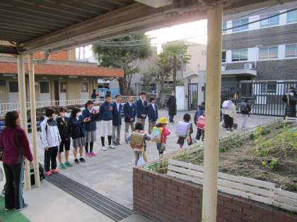小中連携の一環として,二条中学校の生徒会のみなさんが,正親小学校の下校時間に合わせてあいさつ運動をされました。下校する児童に,中学生のお兄さん,お姉さんが「さよなら」と明るく元気よくあいさつをしてくれました。ずらりと整列した中学生に,少し恥ずかしそうにしている児童もいましたが,今までになかった小中の交流をこれからも大切にしていけたらと思います。