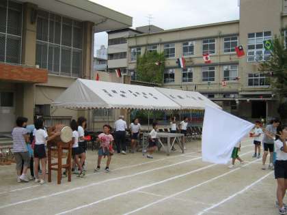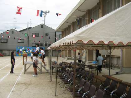 テントを立てたり,万国旗を張ったり,長椅子を運んだりしました。