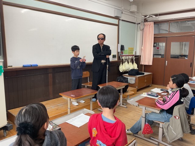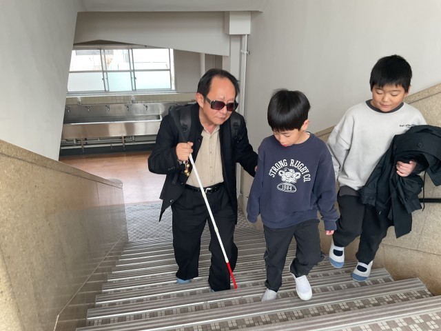 アイマスク・手引き体験も行い、子どもたちは「見えないことってこんなに大変なことなんだ」や「手引きをするときには声掛けをすると安心してもらえるんだ」などとたくさんの発見をしたようです。