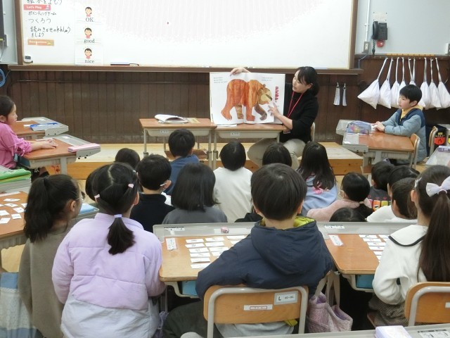 「BROWN BEAR,BROWN BEAR,WHAT DO YOU SEE?」のフレーズを、子どもたちと一緒に声をそろえて読み進めました。