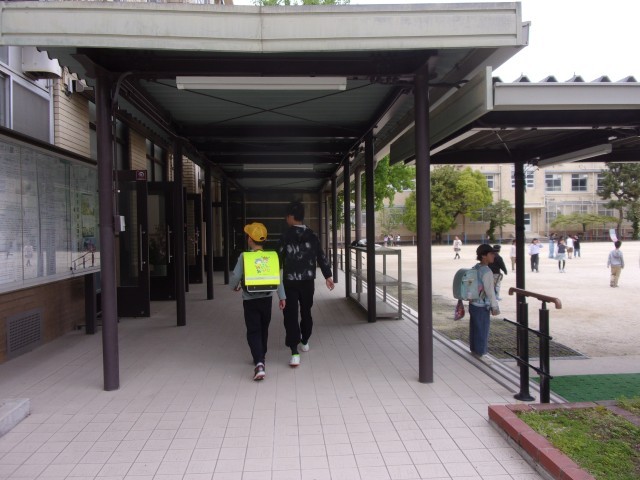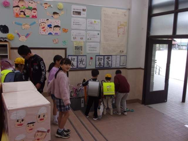 今日は、傘を置く場所や給食袋を掛ける場所を優しく教えてくれていました。6年生が声をかけると笑顔になる1年生もいました。