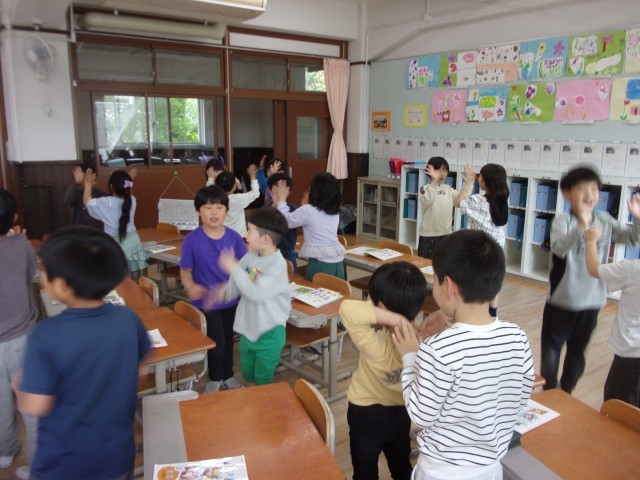 音楽の時間には「子犬のマーチ」をみんなで楽しく歌っています。はじめは自分で手をたたきながら歌っていましたが、「友達と手を合わせてやりたい。」「最後にワン!とかわいく吠えたい。」といろんな楽しい歌い方の案が出てきました。歌っているみんなの様子はとても楽しそうで笑顔いっぱいです。