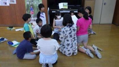 「ふるさと」の歌を3つのパートに分かれて歌うために,グループで話し合っています。