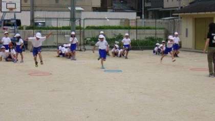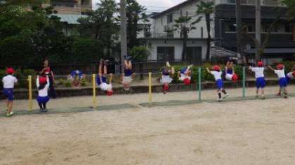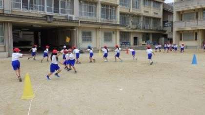 2年1組は「てつなぎおに」をしています。2年2組はフラフープを使って活動しています。2年3組は鉄棒をしています。